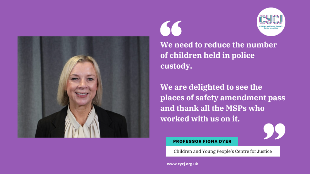 Professor Fiona Dyer, Director of CYCJ: “We’ve said for a long time that the number of children in police custody needs to be reduced. Children and Young People have told us that it is often the most distressing part of their justice journey and that they would receive much more appropriate support in an alternative place of safety. We are committed to working with the new Scottish Government after the election to make this change a reality on the ground.”